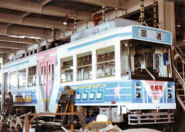大出力120kw電動機を直角カルダンで駆動するシステムとこれを支える空気ばね台車、そして電機子チョッパ制御等かつてないメカを多数採用した路面電車です。